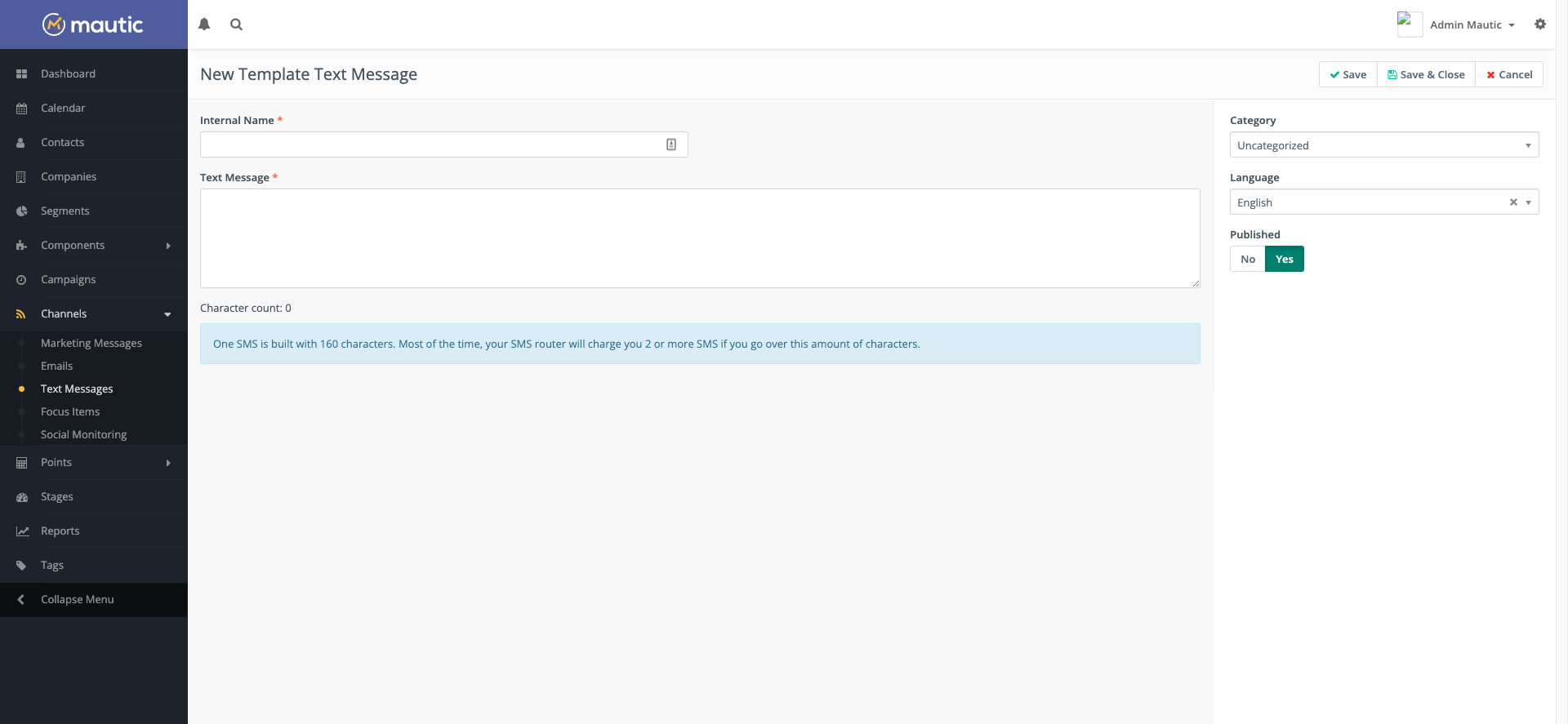 Internal name - This is the internal name used within Mautic when referring to this Text Message. For example Mautic uses this in dropdown selection lists in the Campaign Builder.