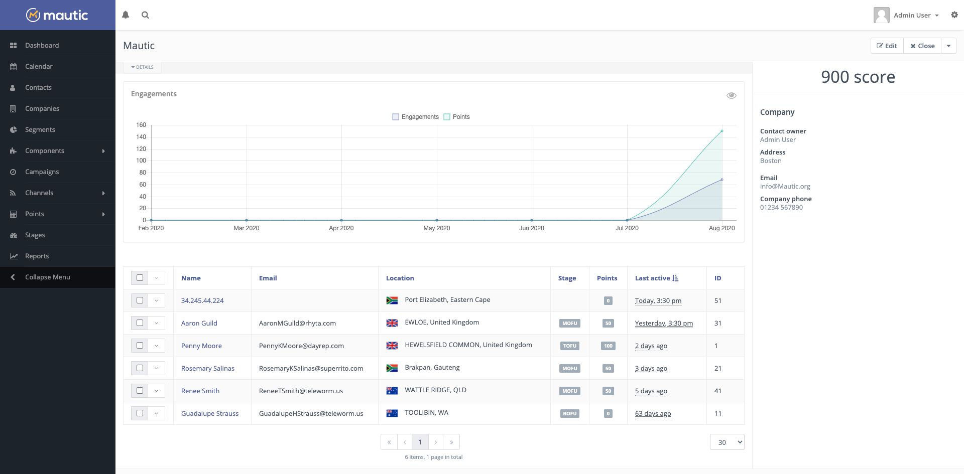 Engagements shown on the chart include any tracked action the Contacts made. Some examples might include page hits, Form submissions, Email opens and so on. The engagements line chart displays how active the Contacts of the Company were in the past 6 months. The chart displays also the sum of Points the Contacts received.