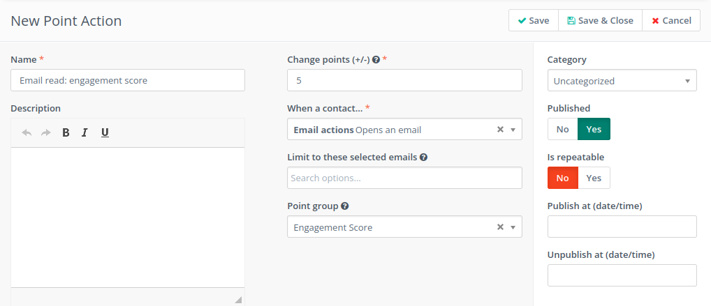 Point Groups is a feature that allows users to categorize the score of their Contacts. By setting up Point Groups, users can assign a specific number of Points to each action taken by a Contact, such as opening an Email, visiting a Landing page, or downloading an Asset.