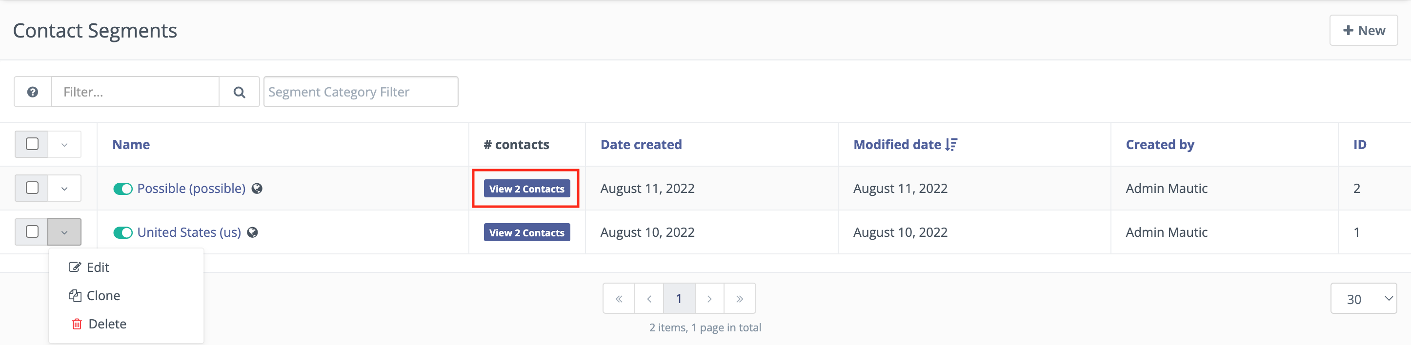 To view Contacts in a specific Segment, click View X Contacts from your Segment list or in the Contacts section of Mautic, enter segment:segment-alias in the search bar.
