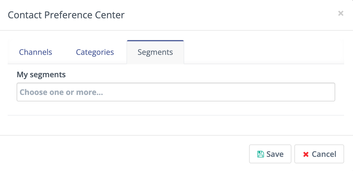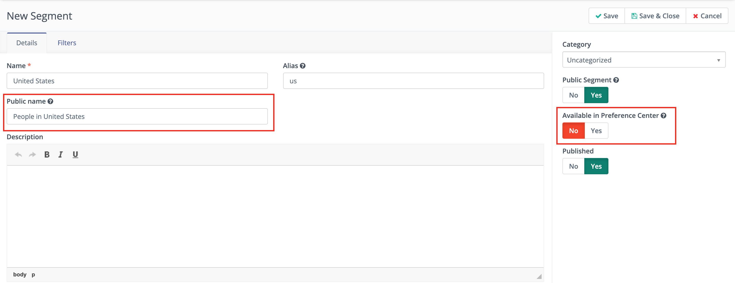 Available in Preference Center - If set to Yes, Contacts can see and opt into or out of the Segment on a Preference Center page. The Segments display if the Preference Center has the Segment List slot type.