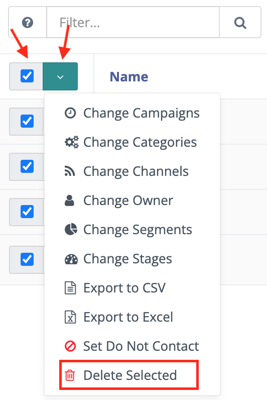 It’s possible to delete all Contacts in a Segment manually rather than with a Campaign action. To do this, first create a Segment with filters that picks up all the Contacts you want to delete.
