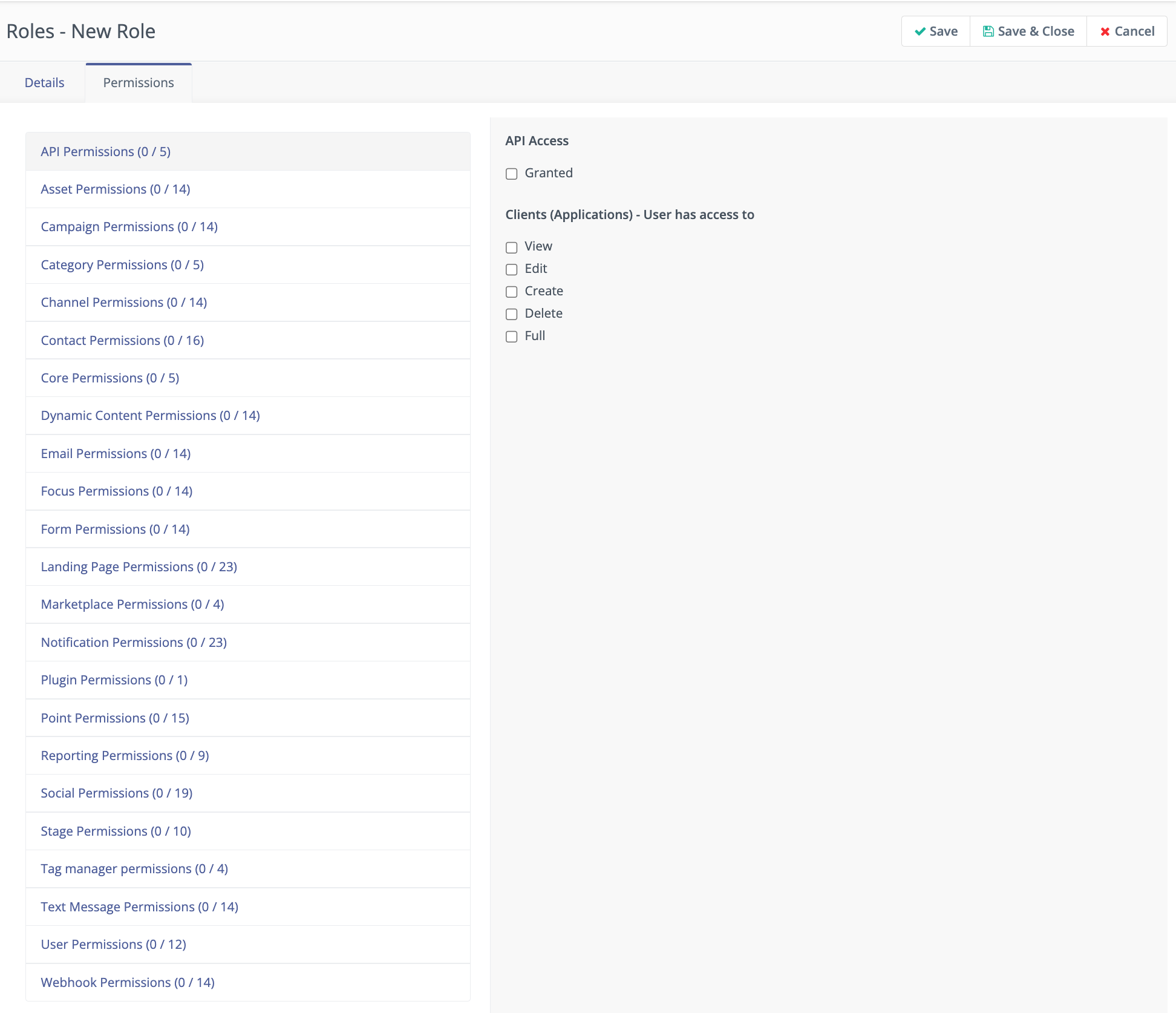 view/edit/delete/publishtheir own resources in this part of Mautic, but not those created by othersOthers - this allows the Users with this Role to